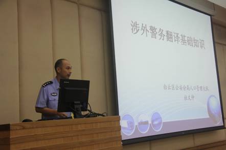 广州市公安局白云区分局人口管理大队杜文仲警官以“涉外警务翻译基础知识”为主题,对涉外警务翻译形式、警务翻译要求、警务翻译原则、外国人管理基础知识做了详细的讲解,普及了许多实用性的涉外警务常识。